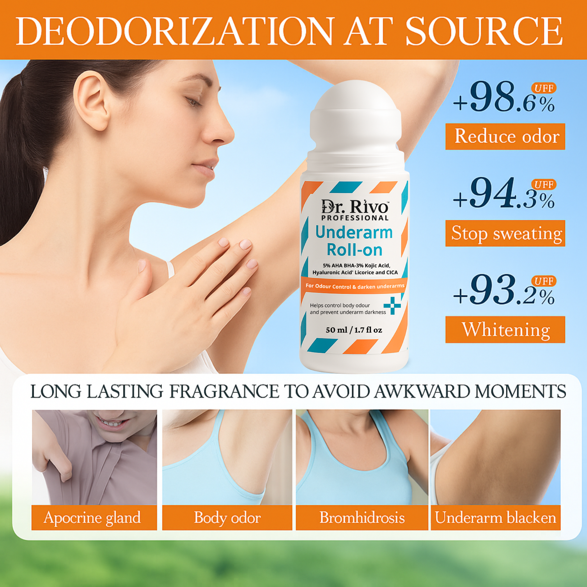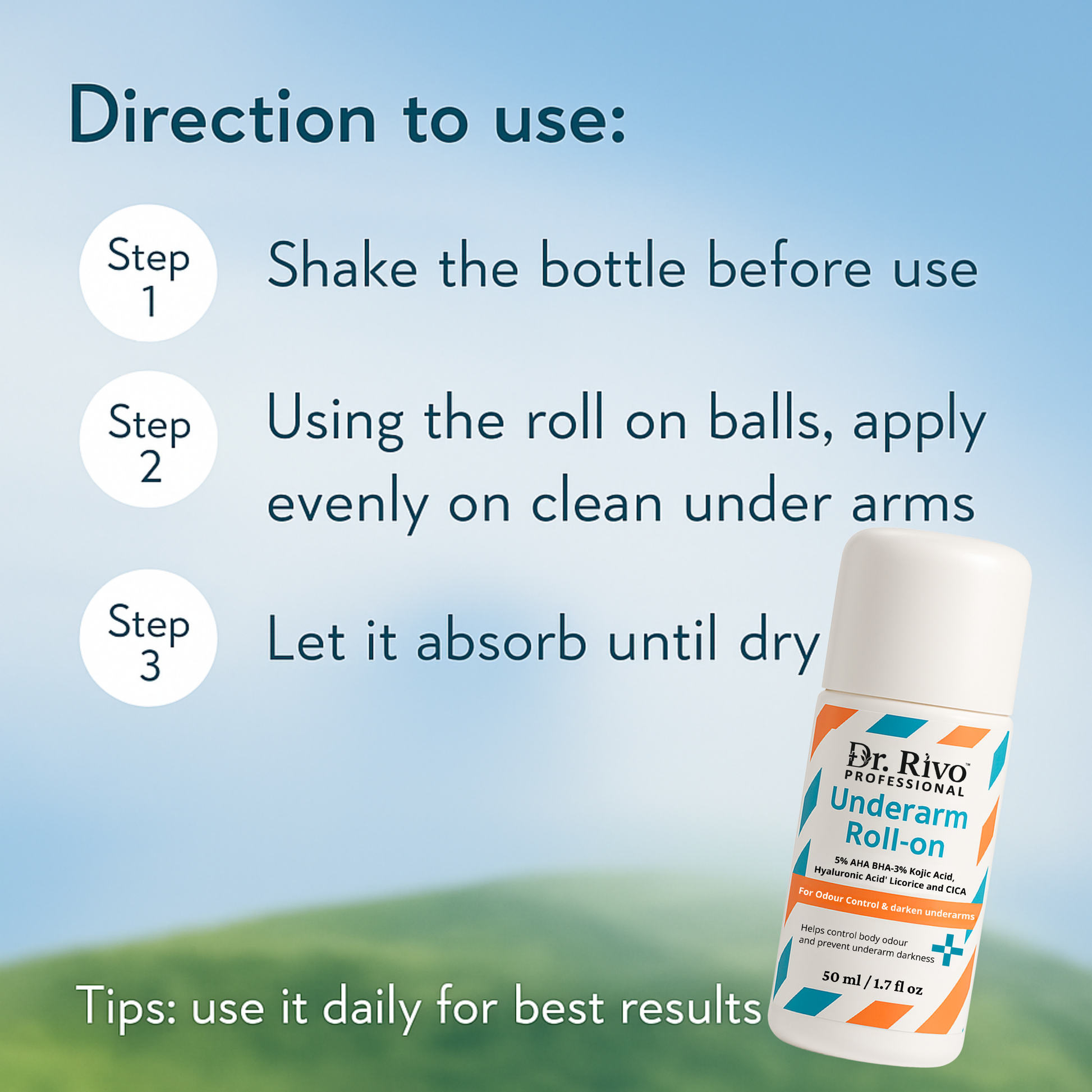 Dr. Rivo Professional 4% AHA BHA Underarm Roll-On is scientifically formulated to target dark underarms and unpleasant odour. Enriched with powerful actives like 5% AHA BHA, 3% Kojic Acid, Hyaluronic Acid, Licorice, and CICA, this roll-on gently exfoliates dead skin, controls sweat and body odour, and visibly brightens the underarm area with regular use. Suitable for both men and women, it helps restore your natural skin tone while keeping you fresh all day.